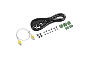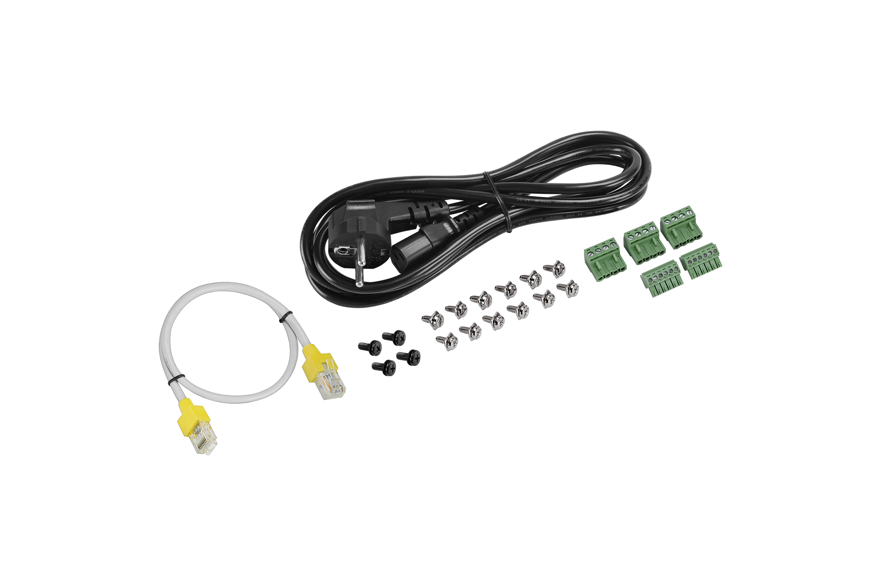 Блок 1 шт., комплект крепежа для установки блока в аппаратный шкаф, комплект клеммных 2-контактных разъемов Euroblok, комплект клеммных 5-контактных разъемов Euroblok, патч-корд (RJ-45-RJ45) длина 0,45м, силовые соединительные провода 4 шт., руководство пользователя