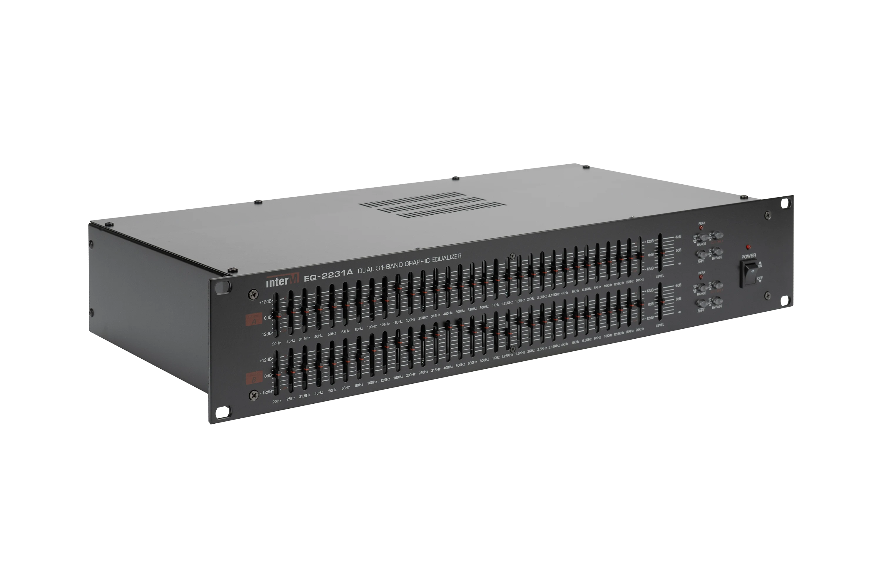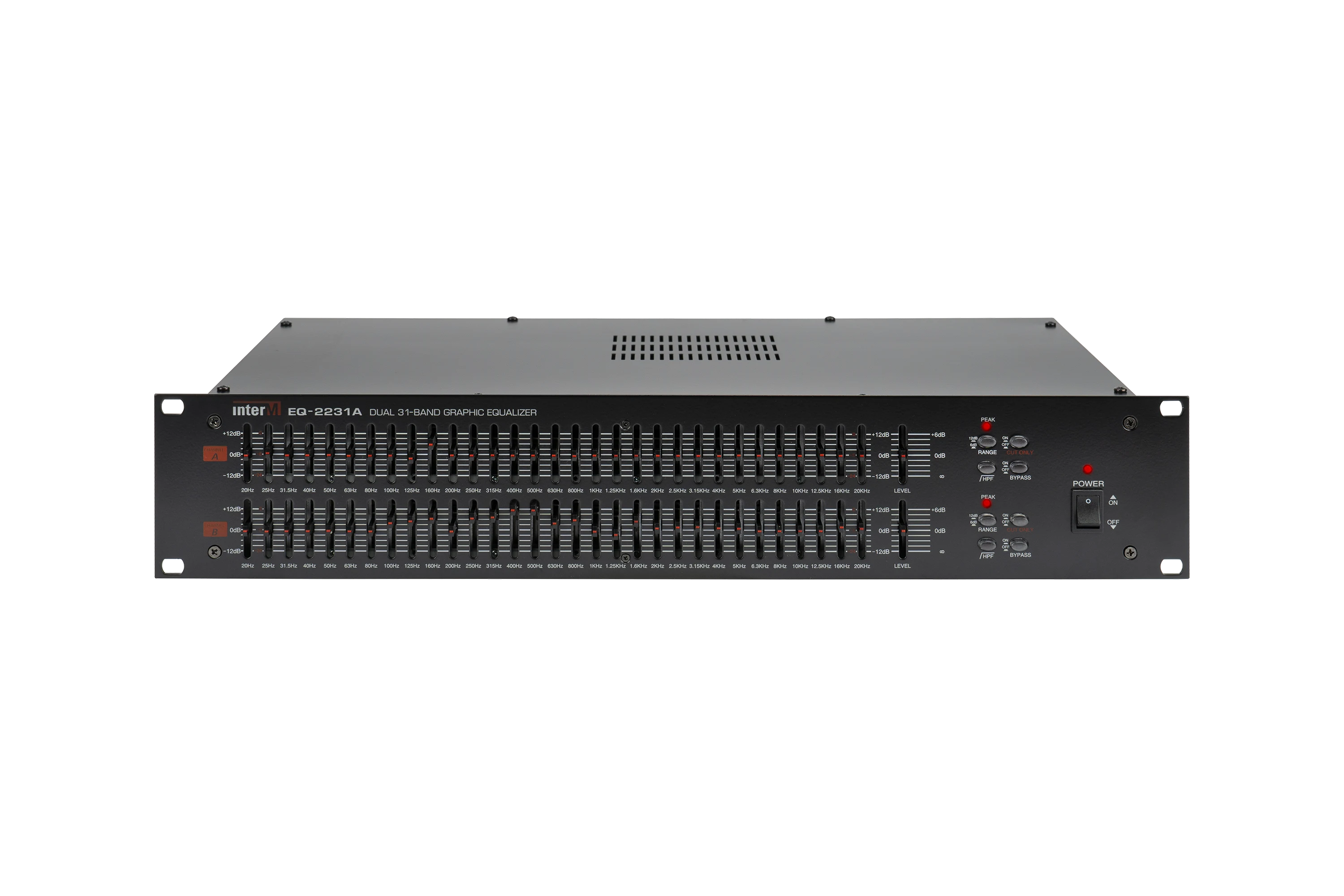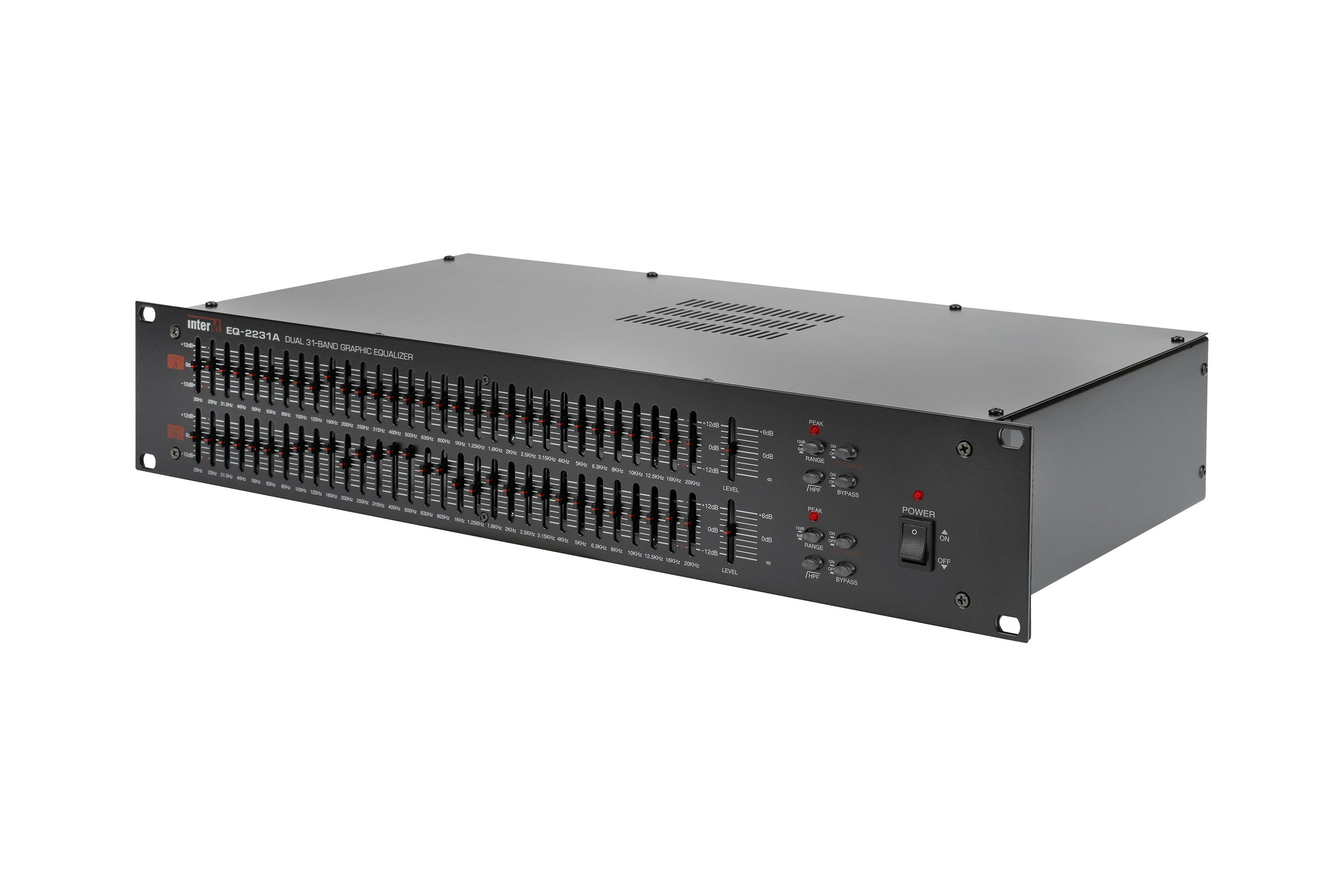 Эквалайзер EQ-2231A имеет 2 независимых канала, в каждом из которых предусмотрена 31 полоса для регулировки амплитудно-частотной характеристики. Выбор центральных частот для полосовых фильтров соответствует международным стандартам, соседние частоты отличаются на 1/3 октавы. В каждом из каналов входной сигнал разбивается полосовыми фильтрами на 31 составляющую. Пользователь может для каждой составляющей аудио сигналов с помощью регуляторов установить собственный коэффициент ослабления или усиления. Регуляторы выполнены в виде вертикальных 'слайдеров'. Диапазон регулировки может быть выбран пользователем и составляет 12 или 24 дБ.