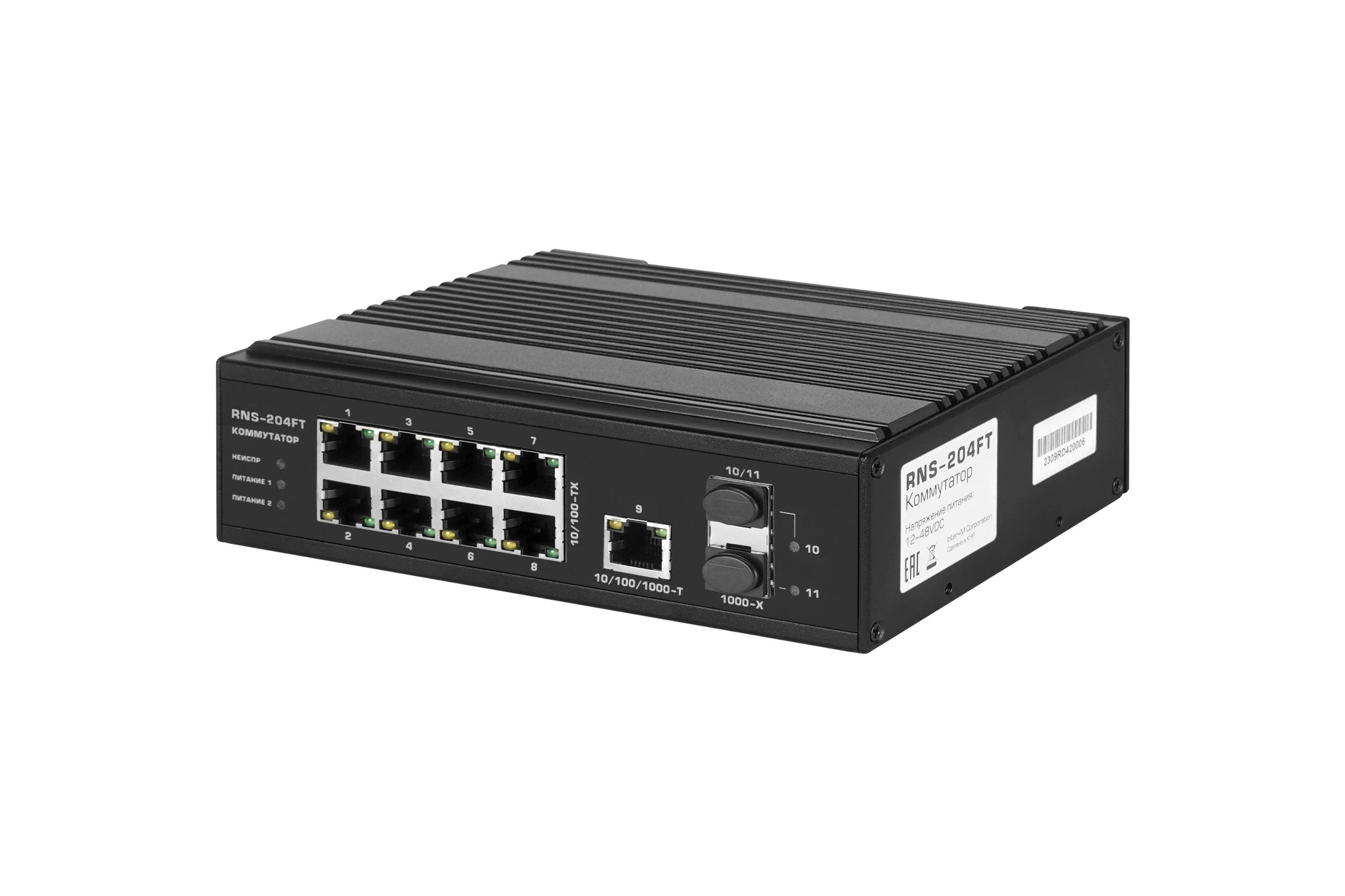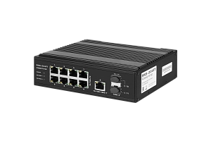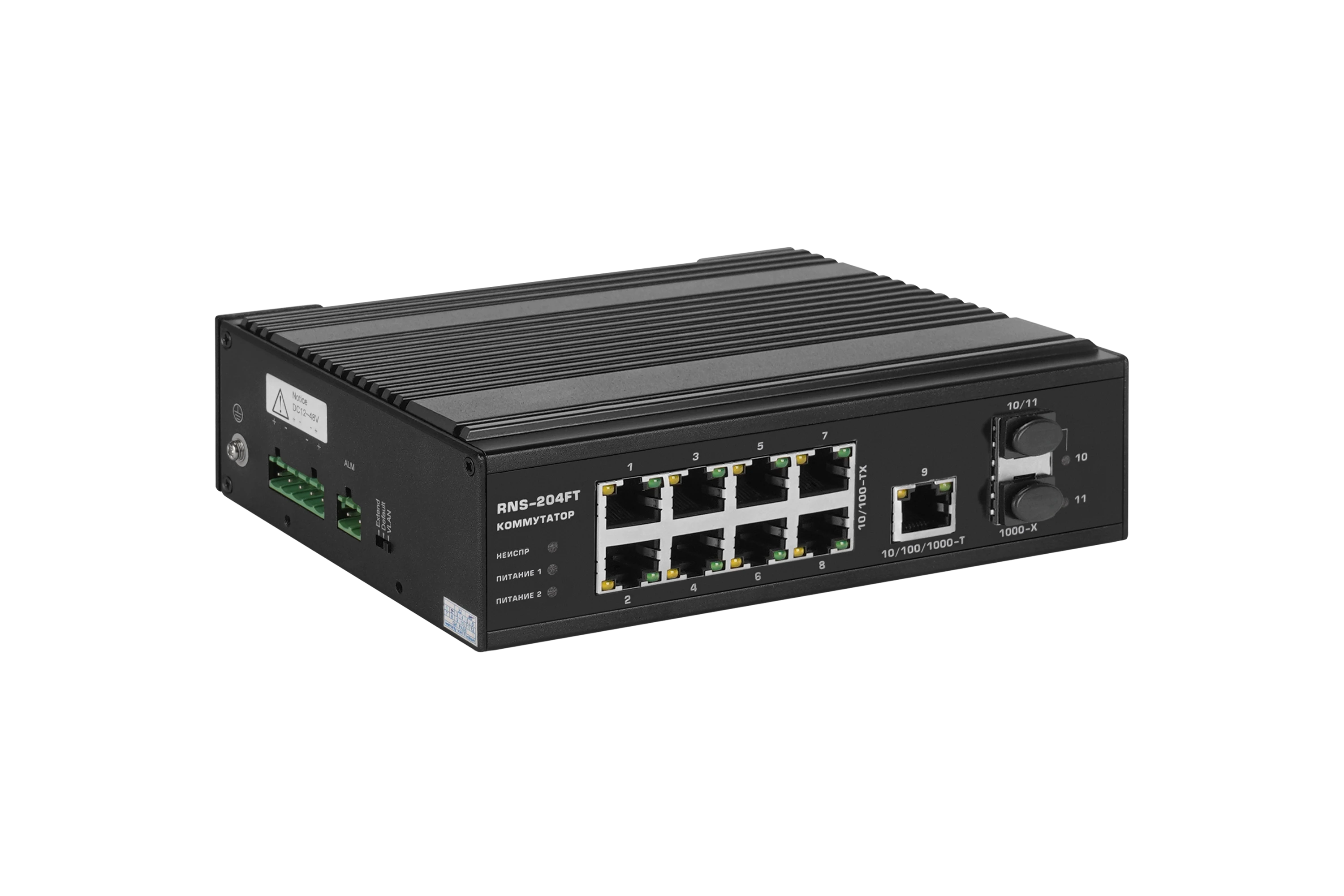 11-портовый промышленный Ethernet-коммутатор с гигабитными оптическими трансиверами в комплекте, предназначен для работы в жестких температурных условиях, отвечает требованиям по защите от импульсных помех и электростатического заряда. Поддерживает питание от резервного источника, оснащен световой и релейной сигнализацией пропадания одного из питающих напряжений или отсутствия передачи данных, препятствует образованию широковещательного шторма путем изоляции портов в режиме VLAN, осуществляет передачу данных на увеличенное до 250 метров расстояние в режиме EXTEND.