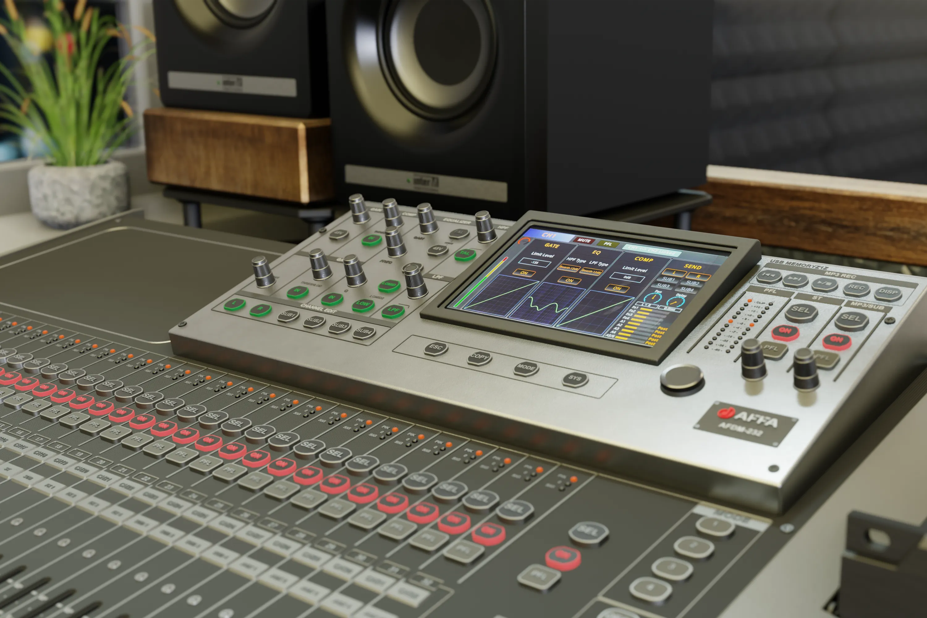 Цифровой микшер AFDM – 232 обеспечивает микширование сигналов с 32 аналоговых входов. Дальнейшая маршрутизация микшированных сигналов может осуществляться на 12 выходов. В цифровом микшере происходит преобразование входных аналоговых сигналов в цифровой код, далее вся обработка звуковой информации происходит в цифровом виде и на выходах цифровая информация преобразуется в аналоговую форму. Благодаря этому обеспечиваются очень высокие звуковые характеристики. .Цифровой микшер реализует такие функции, как линия задержки, параметрический эквалайзер, лимитер, автоматическое микширование. Управление микшером может осуществляться с передней панели или удалённо через компьютер по Ethernet сети.