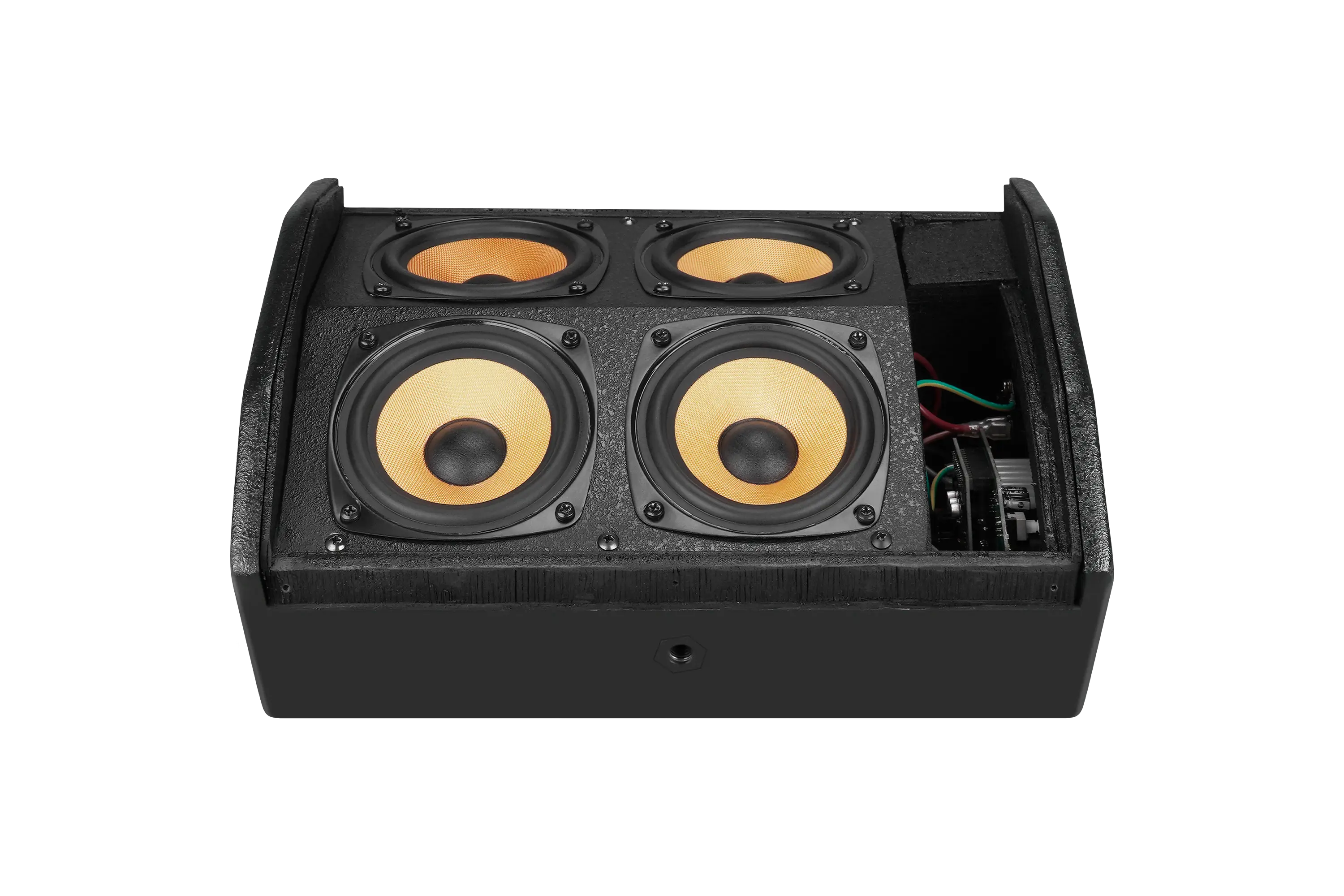 Динамики размещены практически вплотную друг к другу, образуя квадрат (или близкую к нему форму). Центры излучателей находятся на небольшом расстоянии друг от друга относительно длины волн средних частот. Они оптимизированы для эффективной работы в среднечастотном диапазоне (главном для разборчивости вокала и инструментов на сцене). Квадратное расположение динамиков, работающих когерентно (в фазе) на средних частотах, создает источник, близкий к точечному. Это приводит к широкому углу охвата и более равномерному распределению звука по горизонтали по сравнению с одиночным динамиком или даже парой.