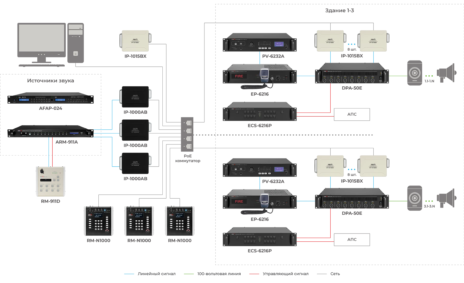 На обычные входы PGM усилителей поступают балансные линейные сигналы с выходов аудиомостов IP-1015BX, сформированных как выходные зоны для распределенной сетевой IP-системы оповещения.