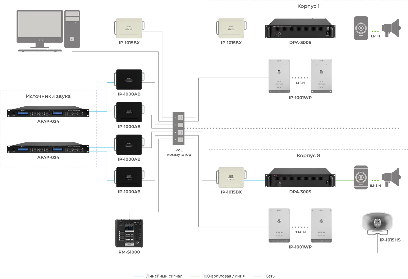 С помощью преобразователей аудиовхода IP-1000AB аудиопоток с AFAP-024 преобразовывается из аналогового в цифровой вид, далее эти цифровые данные по IP-сети через PoE-коммутаторы доставляются на расположенные в каждом корпусе аудиомосты IP-1015BX, где преобразуются обратно в аналоговый линейный сигнал.