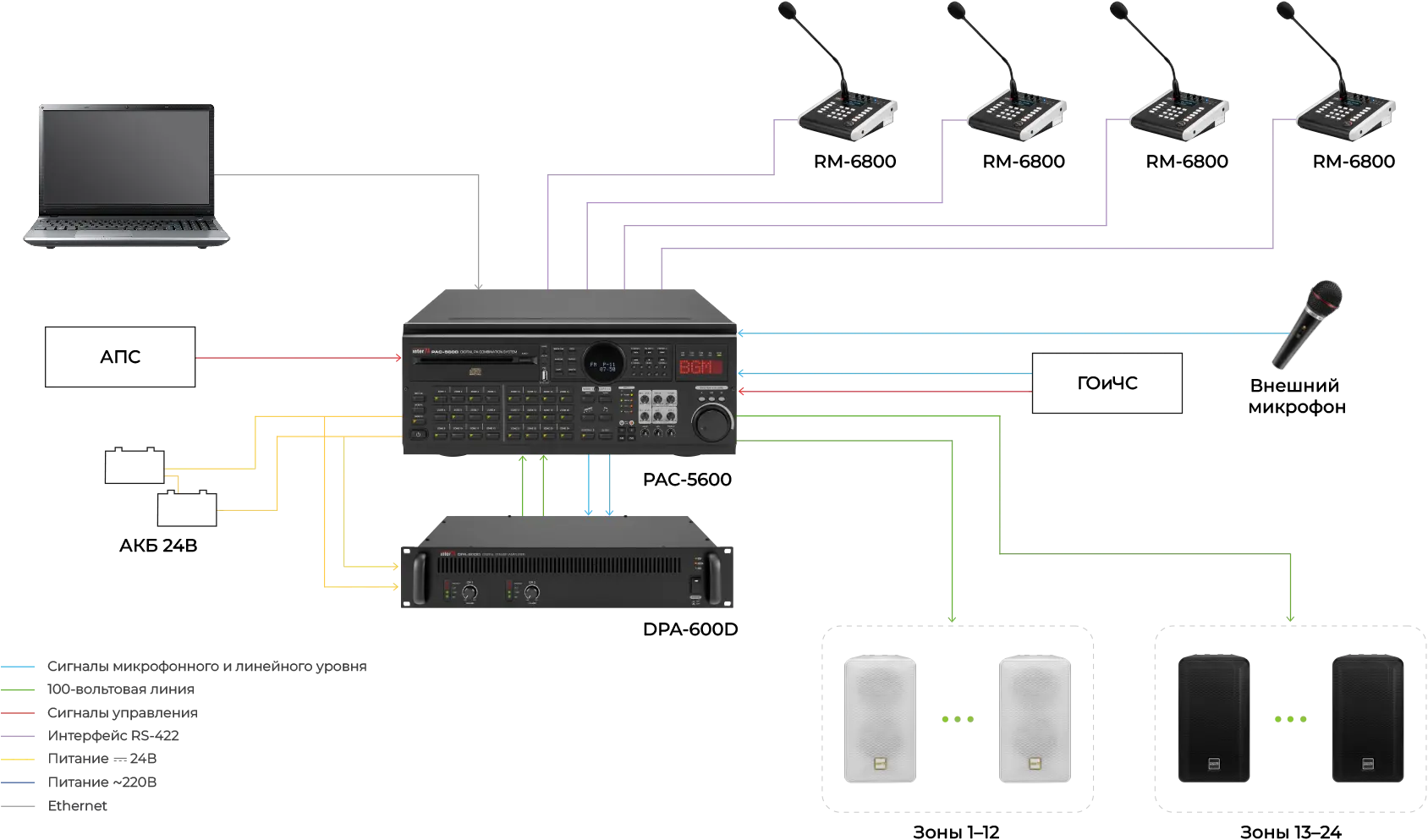 Система оповещения рассчитана на 24 зоны — по 12 зон на канал усиления.
