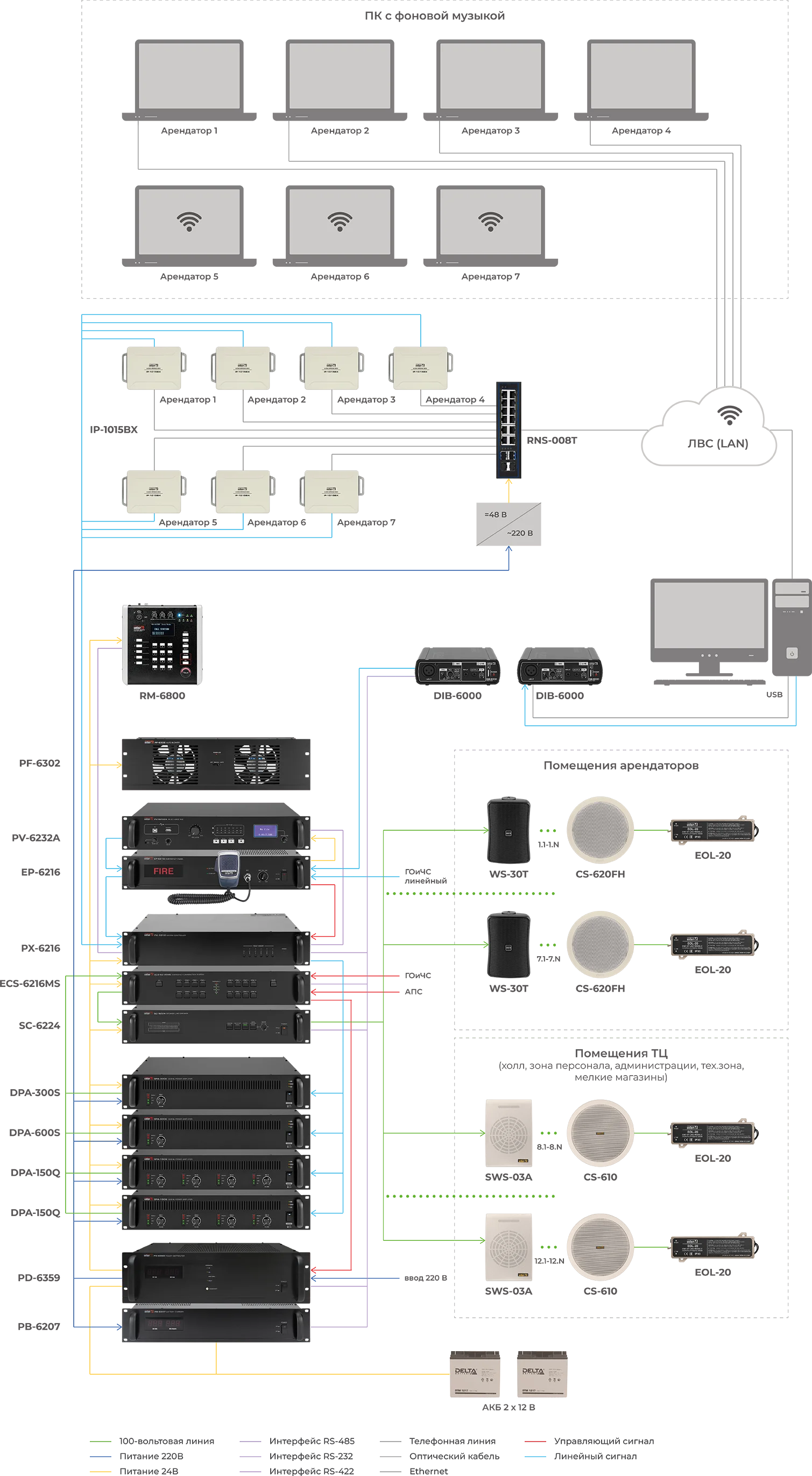 Все манипуляции выполняются через интернет — арендатор не имеет физического доступа к оборудованию системы и аудиомостам других арендаторов. Важно также, что аудио от сетевого IP-аудиомоста IP-1015BX в системе имеет самый низкий приоритет, то есть при чрезвычайной ситуации работа аудиомоста никак не помешает тревожному оповещению согласно прописанному в контролере алгоритму, доступ к которому имеет только администрация ТЦ.